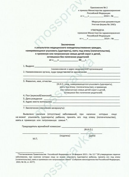 Форма, порядок работы медкомиссии и процедура освидетельствования здоровья будущего родителя или опекуна регламентирует Приказ Министерства здравоохранения РФ от 18.06.2014 г. № 290н.
